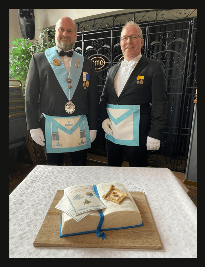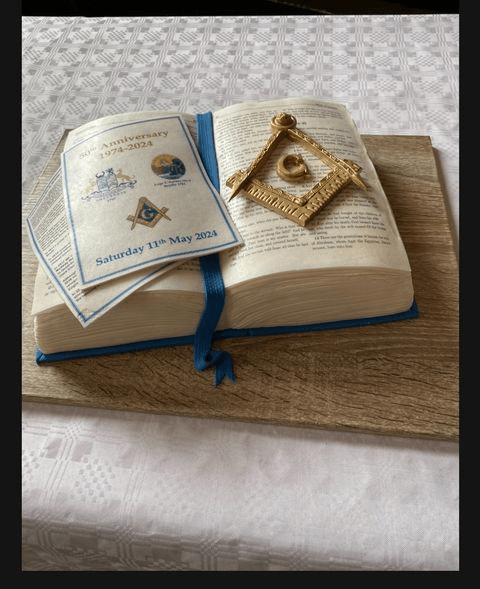 And to complete the 50th anniversary of the twinning of Adam’s Lodge and Loge L’Aurore, a wonderful celebration cake to remember this milestone had been made by the Charity Steward’s daughter Jo, which went down well with the coffee.