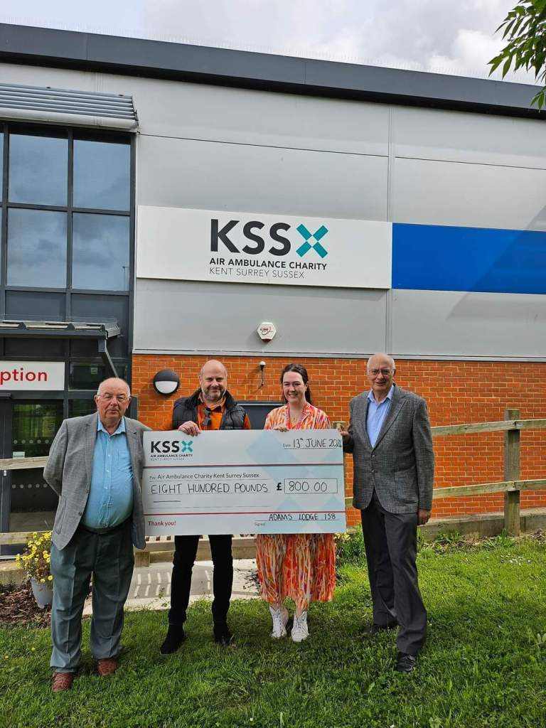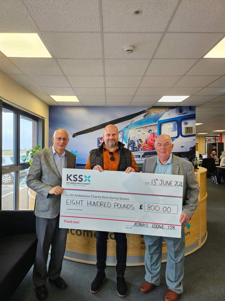 £400 was raised at a recent Adam’s Social evening, and the lodge were delighted that “The Cornwallis East Kent Freemasons Charity” backed the donation with a further £400, allowing the lodge to support The KSSX recent county wide appeal with £800. The total raised in just a couple of months by this worthy charity is over 2 million pounds, allowing the Kent Ambulance to be in the air a further 3 hours a day.