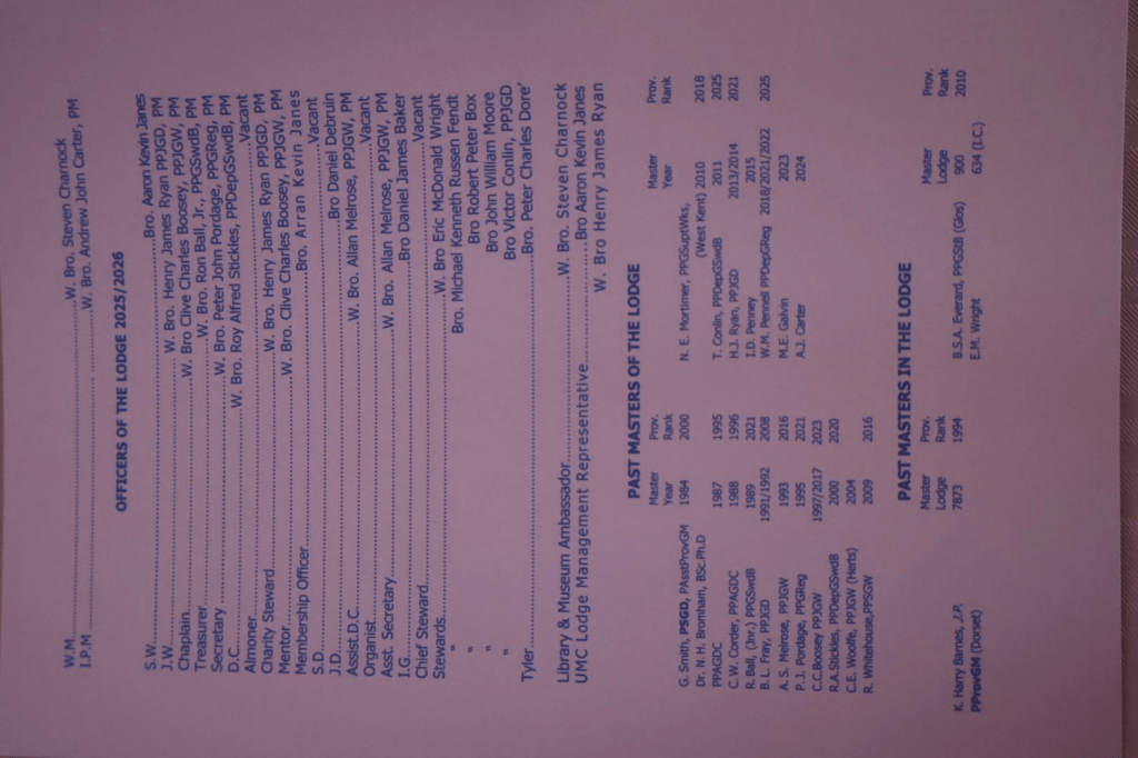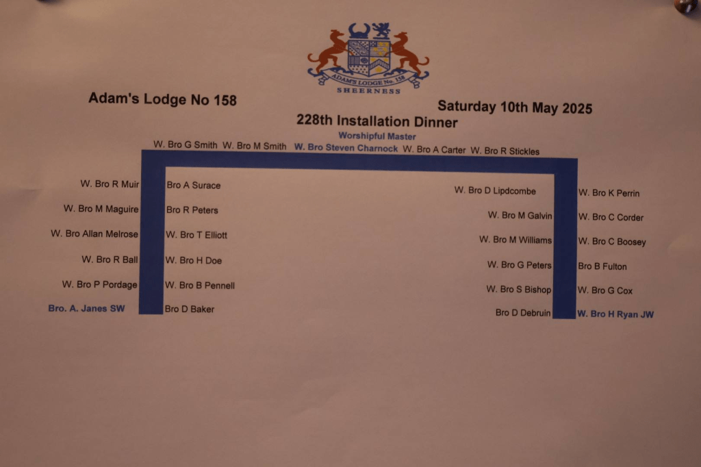 W.Bro Charnock was installed back into the chair after 30 years (1st time for Adam’s) in a wonderful ceremony conducted by our now IPM W.Bro Carter. Bro.Janes our SW gave a heartfelt appeal to membership specific to Adams and the Province in general. Our JW W.Bro Ryan updated Brethren on achieving Bronze grade for the 2025 festival board.